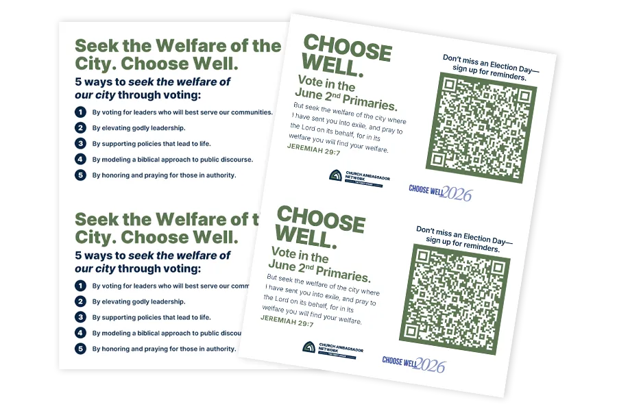 Practical tools to help you shepherd your congregation in seeking the welfare of the city through God-honoring voting during the 2026 election season.